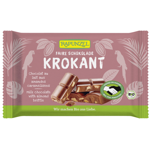 Chocolat au lait fondant aux délicieuses amandes caramélisées croustillantes, issu du programme HAND IN HAND de Rapunzel qui allie écologie et commerce équitable. Avec les matières premières de qualité, le conchage intensif est le véritable secret de ce délicieux chocolat. Grâce au conchage, les riches arômes cacaotés se libèrent petit à petit jusqu'à leur plein épanouissement. Et toute la subtilité et le fondant incomparable du chocolat se dévoilent.