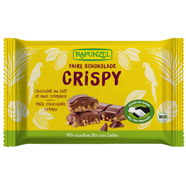Ce chocolat au lait fondant aux crispies de céréales est issu du programme HAND IN HAND de Rapunzel qui allie écologie et commerce équitable. Avec les matières premières de qualité, le conchage intensif est le véritable secret de ce délicieux chocolat. Grâce au conchage, les riches arômes cacaotés se libèrent petit à petit jusqu'à leur plein épanouissement. Et toute la subtilité et le fondant incomparable du chocolat se dévoilent.