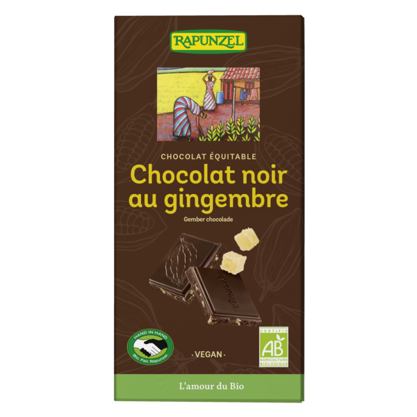 Le gingembre confit en morceaux donne son arôme chauleureux et légèrement épicé à ce chocolat noir corsé. Le chocolat Rapunzel est synonyme de grande qualité dans le respect de la fabrication traditionnelle suisse associée à de précieux ingrédients issus de l'agriculture biologique et du commerce équitable. Avec les matières premières de qualité, le conchage intensif est le véritable secret de ce délicieux chocolat. Grâce au conchage, les riches arômes cacaotés se libèrent petit à petit jusqu'à leur plein épanouissement. Et toute la subtilité et le fondant incomparable du chocolat se dévoilent.