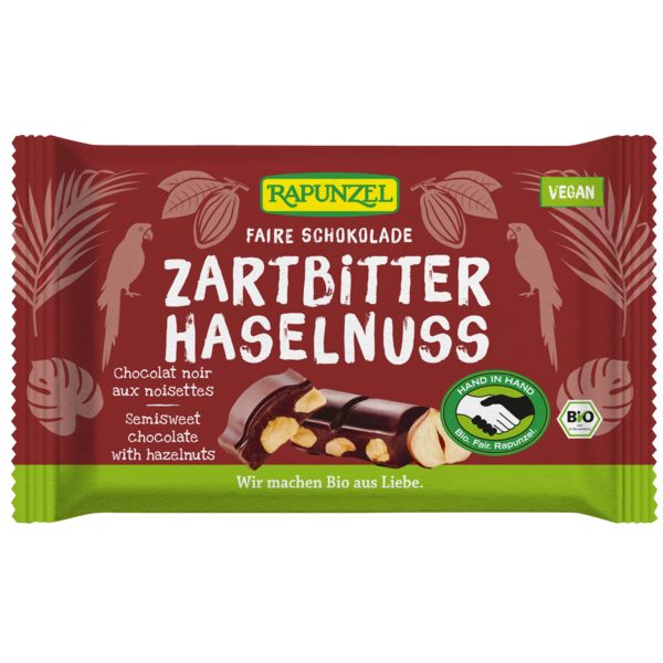 Ce délicieux chocolat noir fondant avec des noisettes entières croquantesest issu du programme HAND IN HAND de Rapunzel qui allie écologie et commerce équitable. Avec les matières premières de qualité, le conchage intensif est le véritable secret de ce délicieux chocolat. Grâce au conchage, les riches arômes cacaotés se libèrent petit à petit jusqu'à leur plein épanouissement. Et toute la subtilité et le fondant incomparable du chocolat se dévoilent.