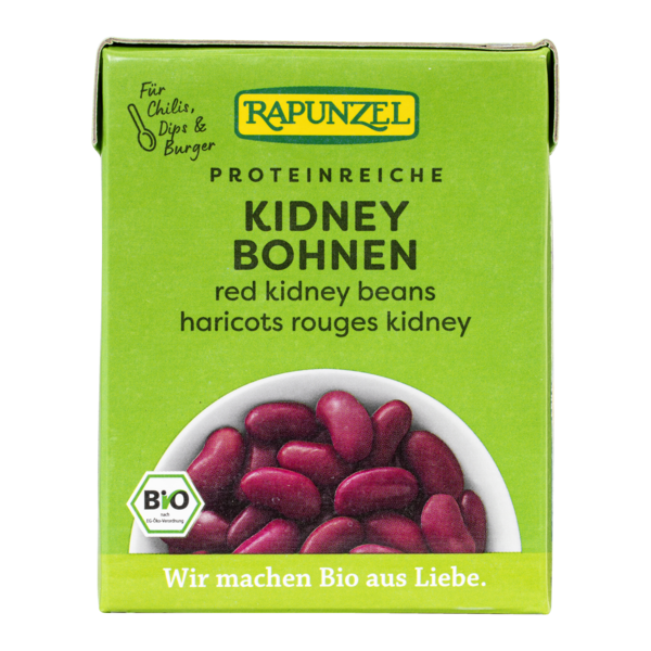Haricots rouges Kidney prêts à l'emploi pour une cuisine bio rapide. Pratique en Tetra Pak. Pas de temps de trempage et de cuisson puisque les haricots ont déjà été précuits doucement. Avec leur léger goût de noisette et leur saveur sucrée, les haricots Kidney se marient parfaitement avec les préparations épicées mais ils peuvent également être utilisés dans les pâtisseries.