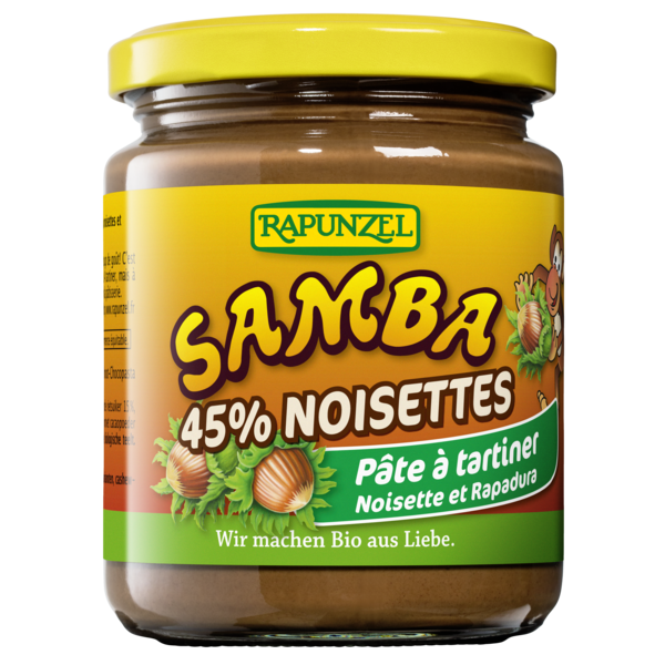 Commencez votre journée en faisant le plein d'énergie grâce à Samba. 45% de noisettes parfumées grillées feront battre le coeur de tous les amateurs de ce fruit à coque. Les noisettes sont accompagnées d'ingrédients nobles tels que du cacao, du lait entier, du sucre de canne complet Rapadura et de la vanille Bourbon pour obtenir cette pâte à tartiner délicieusement fondante. Le sucre de canne complet rapadura, le sucre de canne Cristallino, l'huile de palme et la poudre de cacao sont issus du commerce équitable et fournis par nos partenaires HAND IN HAND. La consistance dépend de la température. Onctueuse à température ambiante, solide en cas de stockage dans le réfrigérateur.