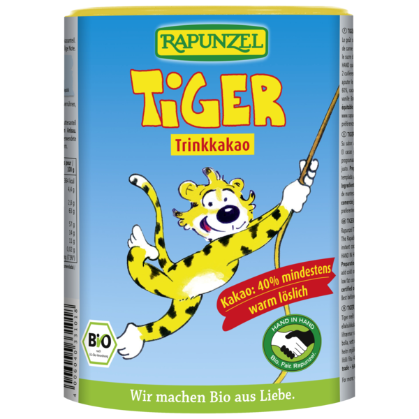 Boisson cacaotée Tiger issue du programme HAND IN HAND de Rapunzel qui allie écologie et commerce équitable. Merveilleusement chocolatée grâce à la teneur élevée en cacao (40%). Sucré au sucre de canne complet Rapadura. Sans émulsifiants.