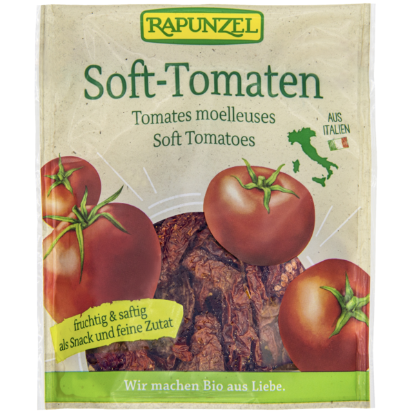 Un régal fruité et juteux, un délicieux en-cas pour une petite pause et un ingrédient idéal pour la cuisine méditerranéenne. Ces tomates sont cultivées en Italie. Elles sont délicatement séchées avant d'être réhydratées dans un bain d'eau chaude. Inutile donc de les faire tremper. Ces tomates moelleuses peuvent être utiliser directement.